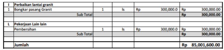 Total biaya ini sangat bergantung pada hasil perhitungan biaya tiap sub pekerjaan. Jika terdapat kekeliruan pada bagian sub, maka total biaya yang diperoleh juga akan tidak akurat. Setelah semuanya tercantum dengan baik, jangan lupa untuk mengurangi biaya pajak.