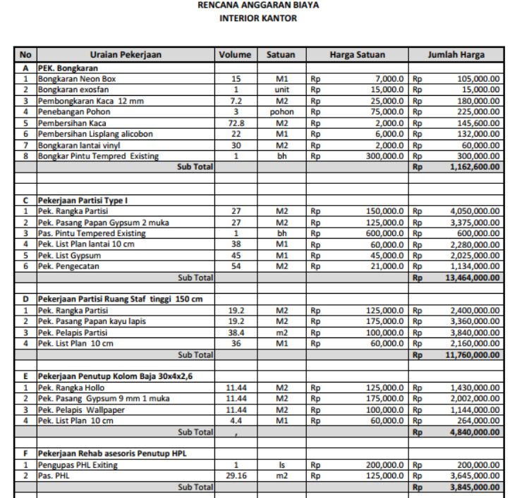 Berbeda dengan rumah, kantor tentu memiliki ukuran yang lebih besar dengan ruangan yang banyak. Oleh karena itu, perkiraan biaya yang dibutuhkan juga cenderung lebih besar. Adapun contoh RAB bangunan kantor adalah sebagai berikut.