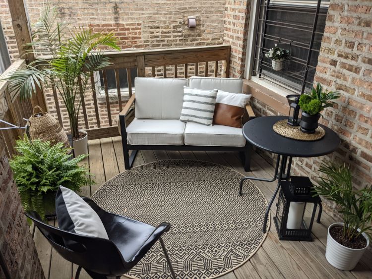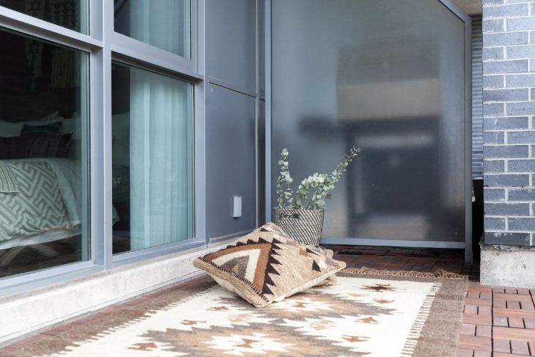 Untuk balkon-balkon berukuran kecil dan spacenya kurang untuk menaruh kursi, Anda bisa mengakalinya dengan menggunakan karpet. Pilih karpet yang punya material kuat dan nyaman untuk duduk-duduk santai. Jika perlu, tambahkan juga beberapa bantal kecil supaya semakin nyaman.