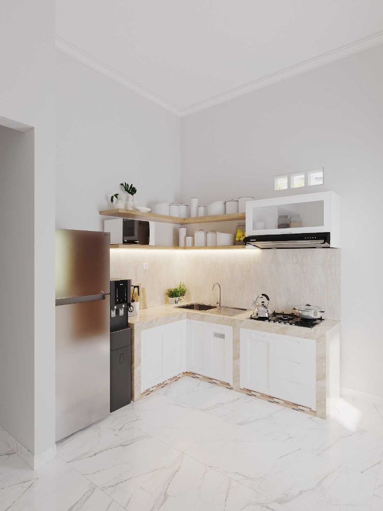 Desain dapur minimalis sederhana selanjutnya mengusung konsep yang simple namun sangat elegan dengan dominasi warna putih yang mewah di dalamnya. Hampir semua bagian di ruangan ini menonjolkan warna putih sehingga terkesan bersih dan luas.
