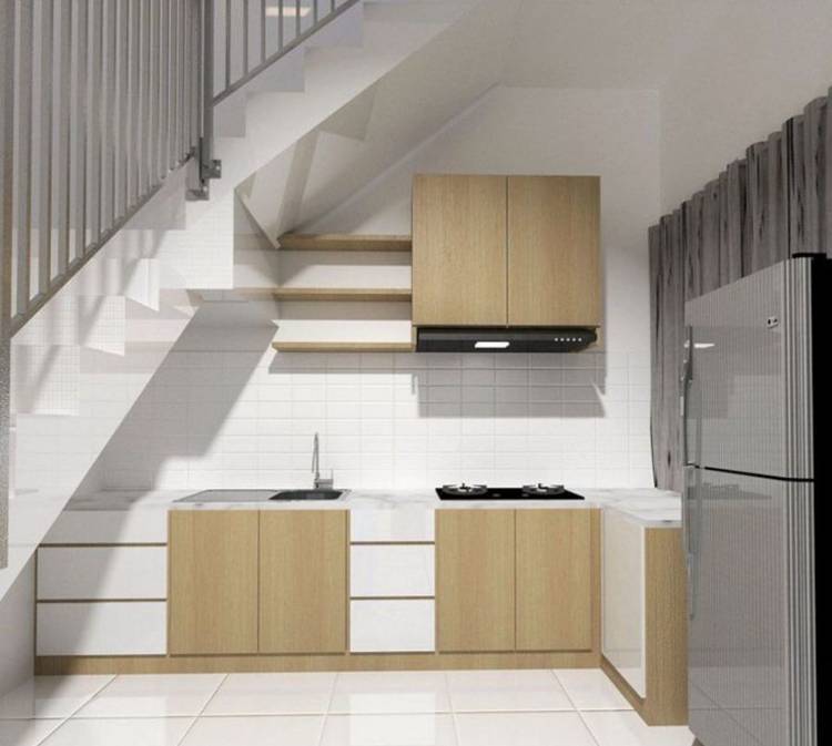 Jika rumah Anda terdiri daru dua tingkat, dan kebetulan letak dapur di dekat tangga, ada baiknya membuat kitchen set dengan memanfaatkan space bawah tangga. Dengan begitu, ruangan akan terlihat multifungsi dan memberikan kesan ‘safe space. Kombinasikan juga warna coklat muda dengan putih, agar lebih terlihat luas.