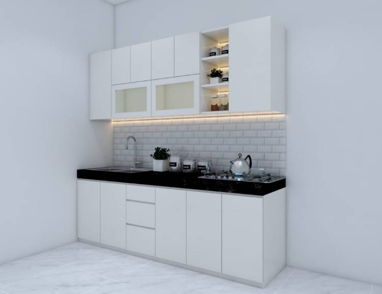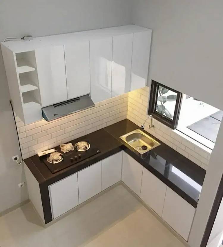 Kombinasi warna putih dan hitam pada kitchen set dengan letter L ini sangat sederhana, namun tetap fungsional dan memberikan kesan minimalis.