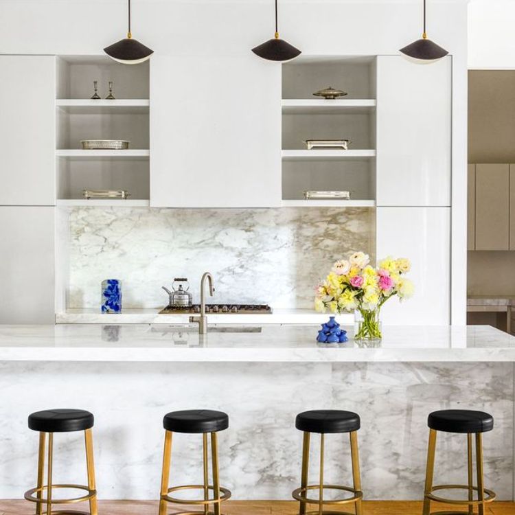 Penataan pada dapur yang satu ini terlihat sangat simple namun tetap menghadirkan kesan yang elegan. Dapur cantik minimalis sederhana ini menonjolkan aksen marmer pada meja dan dinding dapur yang membuatnya terlihat semakin mewah.