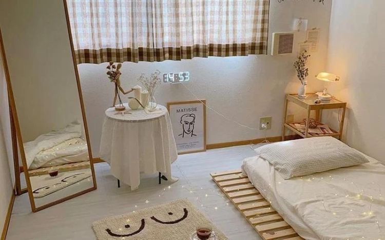 Sentuhan artistik juga semakin kental dengan mengaplikasikan sebuah meja mini di sudut ruang. Sedangkan sudut lainnya adalah kaca seukuran tubuh orang dewasa. Jangan lupa tambahkan barang dekorasi untuk mendukung suasana, seperti lukisan hingga tumblr berwarna warm white.
