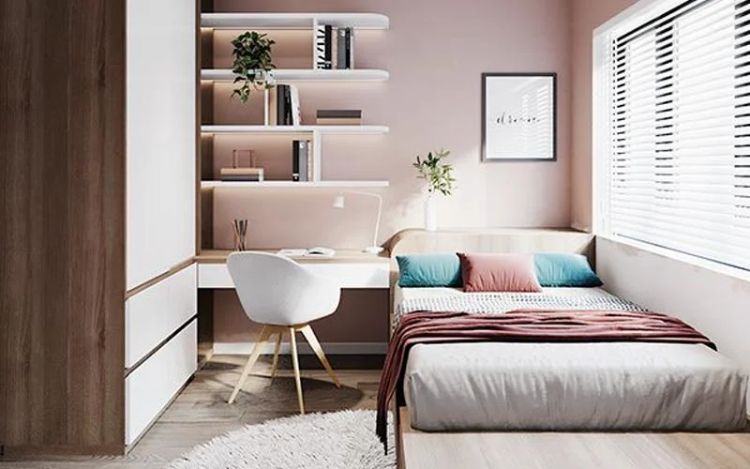 Untuk kamar tidur dengan diameter 3×4 m, maka posisi ranjang bisa diletakkan dengan menempel pada dinding dekat jendela. Sedangkan ruang di samping ranjang dimanfaatkan sebagai meja belajar dengan rak fungsional untuk menyimpan barang, sehingga ruangan tampak lebih terorganisir.