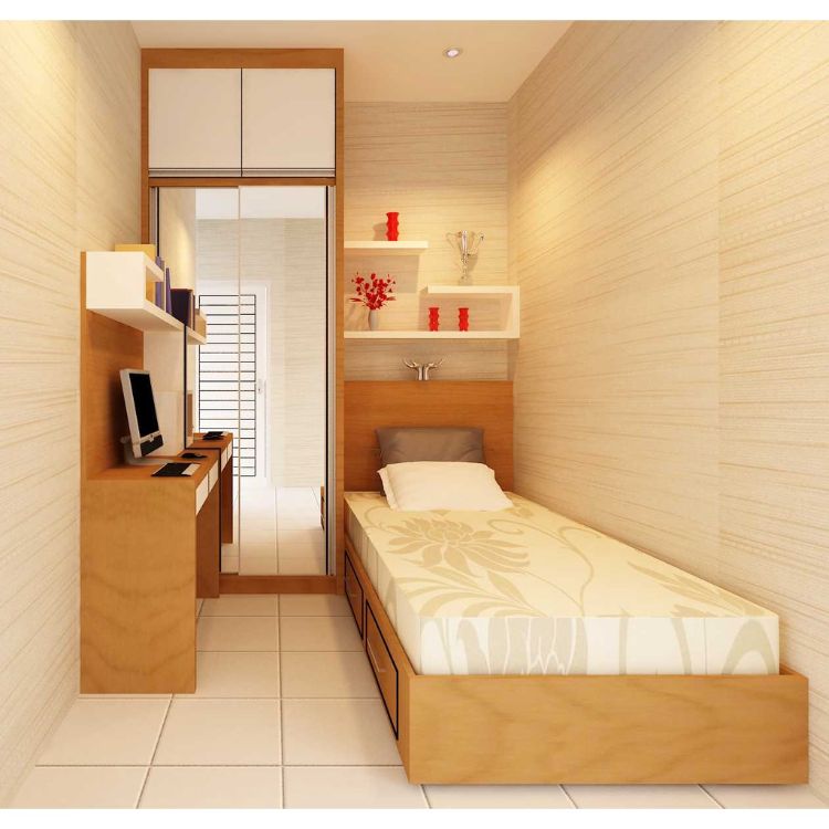 Pilih ranjang single bed untuk menghemat ruang dengan laci di bagian bawah yang dapat dimanfaatkan sebagai area penyimpanan pakaian dan barang lainnya. Penggunaan rak gantung juga relatif efektif untuk memberikan kesan luas dan rapi pada kamar. Di samping ranjang, bisa diletakkan meja dan kursi belajar.