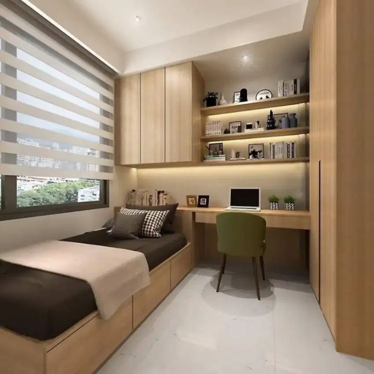 Pilihlah lemari pakaian minimalis dengan desain tinggi namun sempit agar tidak membutuhkan banyak tempat. Dengan begitu, masih ada ruang untuk meja belajar. Barang-barang seperti buku, alat tulis, dan perlengkapan lainnya dapat ditata pada rak dinding multifungsi.