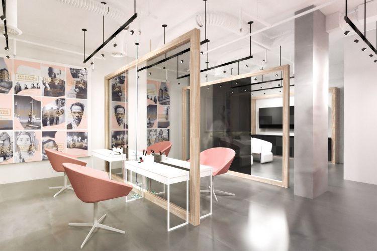Nuansa hangat bisa memberi rasa nyaman dan betah pada pelanggan lho! Anda bisa dominasi ruang salon dengan elemen kayu, misalnya pada lantai, meja, dan bingkai cermin, lalu sempurnakan dengan lampu sorot warna kekuningan. Tapi memasukkan unsur leather pada kursi juga tidak masalah kok.