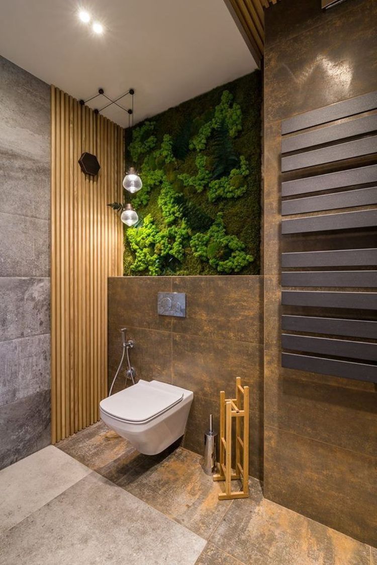 Untuk nuansa menyegarkan dari desain toilet minimalis satu ini berasal dari dinding tanaman yang digunakannya.