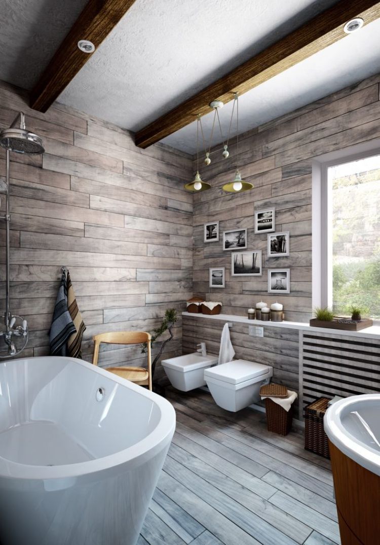 Gunakan material kayu pada beberapa bagian dindingnya, untuk menambah kesan hangat pada ruangan tersebut. Dengan begitu, toilet tersebut dapat terlihat seperti kamar mandi yang ada di wilayah pedesaan.