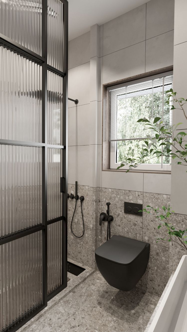 4. Desain Toilet Modern, Natural, dengan Langit-Langit Tinggi