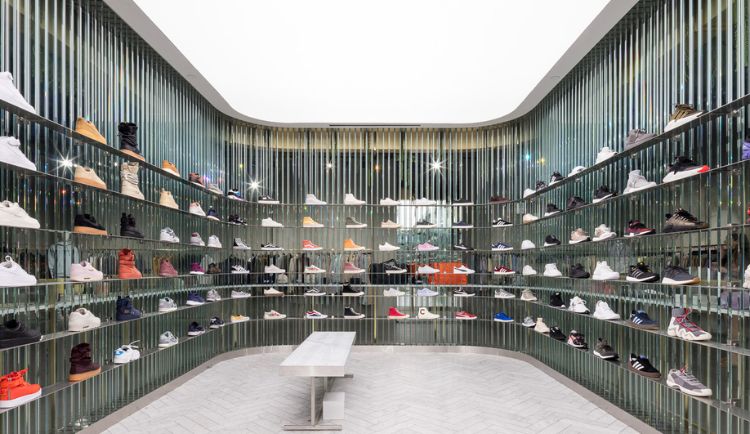 Pada contoh desain sepatu di atas, setiap produknya tertata rapi seperti sebuah rak koleksi sepatu. Model desain seperti ini juga jadi terlihat lebih berkelas. Di bagian tengahnya ada tepat duduk memanjang yang biasanya digunakan untuk pembeli yang mencoba sepatu.