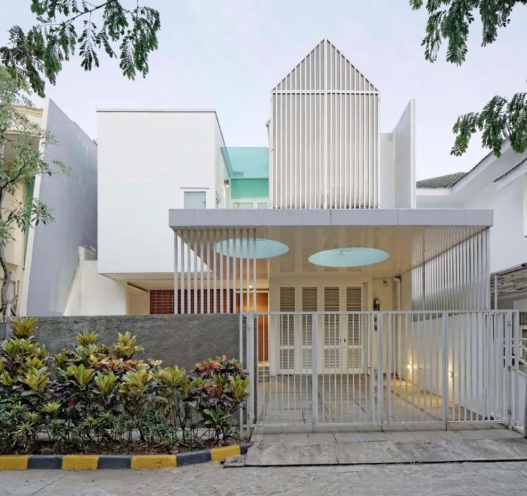 Desain ini akan terlihat sangat modern dan juga berada di daerah tropis dengan konsep warna putih secara keseluruhan. Aksen bangunan segitiga dengan atap pelana menjadi tema utama dari rumah. Pada bagian bawahnya juga dikombinasikan dengan aksen vertikal sehingga semakin menarik.