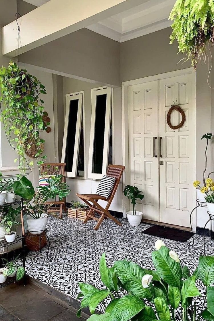 Teras rumah dengan hiasan tumbuhan seperti yang ada pada gambar tersebut memberikan tampilan yang natural untuk rumah tersebut. Jika Anda tidak punya lahan yang cukup untuk membuat halaman, maka teras yang luas bisa Anda jadikan sebagai wadah untuk meletakkan berbagai macam bunga.