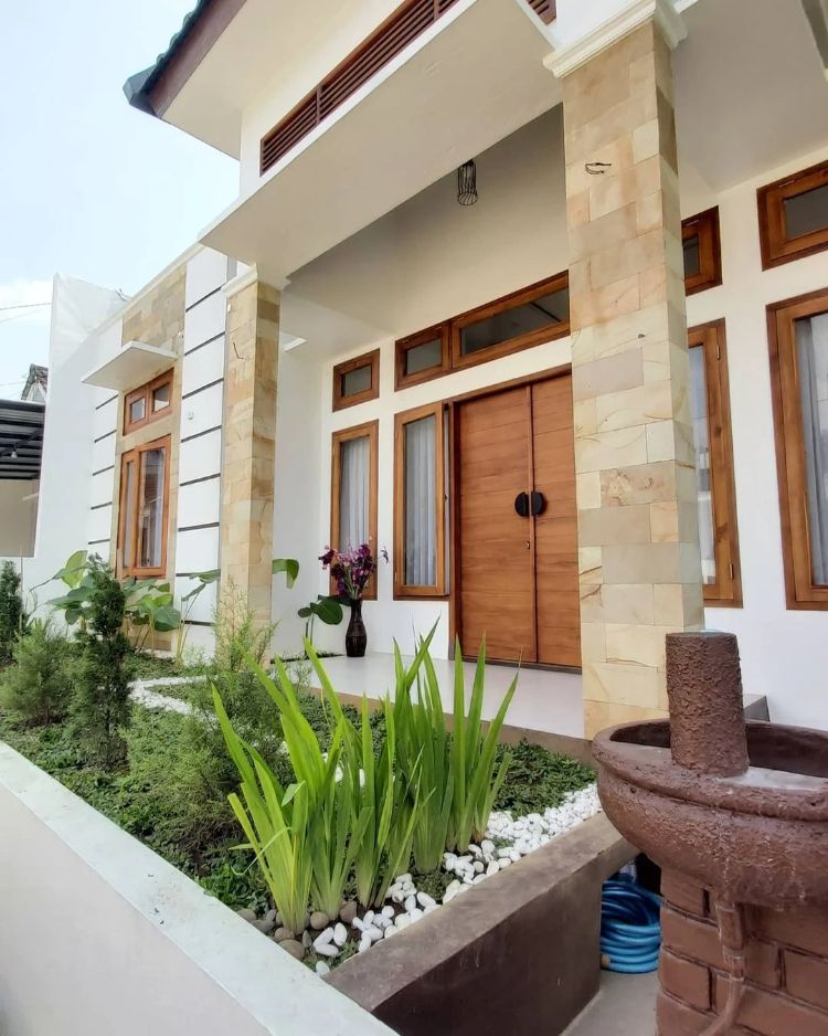 Selain itum adanya bunga-bunga hijau kecil di bagian depannya menambah kesan natural untuk teras tersebut yang sesuai dengan lingkungan sekitar rumah.