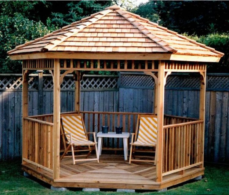 Berbeda dengan gazebo pada umumnya, gazebo ini dihiasi dengan atap yang disusun dengan banyak bangun segi enam yang sangat rapi dan cantik. Tentunya hal ini akan menjadikan gazebo Anda lebih menarik. Selain itu, susunan kayu di sisi samping gazebo juga membuatnya lebih menarik.