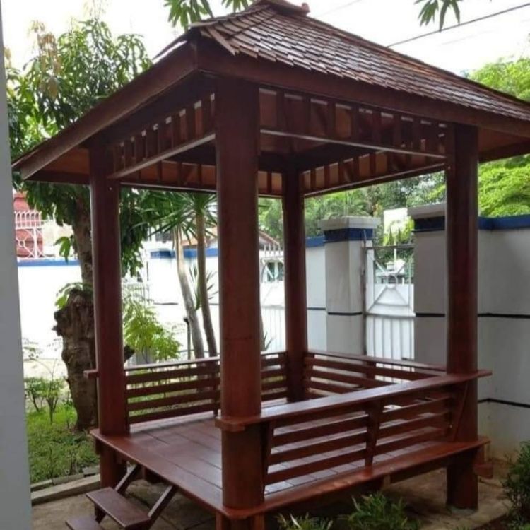 Pada umumnya gazebo memang terbuat dari kayu. Untuk gazebo yang satu ini, pembuatannya dilengkapi dengan cat kayu yang mengkilap sehingga menambah ketegasan dari gazebo tersebut. Selain itu, tangga yang ada di bibir gazebo akan memudahkan Anda menaiki gazebo.