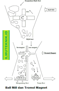 2. Dipisah : Butiran/bongkahan yang mengandung besi dipisahkan dengan bagian-bagian yang tidak mengandung besi dengan alat tromol magnet. Tromol magnet akan mengikat besi pada kamar kiri dan melepaskannya pada kamar kanan, sedang bagian yang tidak mengandung besi langsung jatuh di kamar kiri dan dibuang.