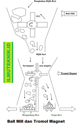 2. Dipisah : Butiran/bongkahan yang mengandung besi dipisahkan dengan bagian-bagian yang tidak mengandung besi dengan alat tromol magnet. Tromol magnet akan mengikat besi pada kamar kiri dan melepaskannya pada kamar kanan, sedang bagian yang tidak mengandung besi langsung jatuh di kamar kiri dan dibuang.