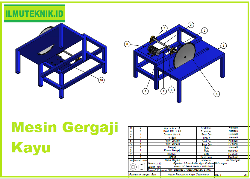 Tidak usah khawatir kami punya solusinya. Mesin Gergaji Kayu diatas didesain sesederhana dan semudah mungkin untuk dibuat. Desain Mesin Gergaji Kayu diatas dibuat menggunakan program buatan autodesk yaitu autodesk inventor 2016.