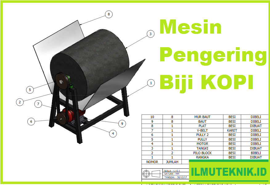 Kopi memiliki cita rasa dan bau khas yang bergantung pada jenis kopi dan tingkat kekeringan kopi tersebut, melihat kondisi tersebut kami ILMUTEKNIK,ID melakukan inovasi dengan membuat desain alat Pengering Biji Kopi. Dengan alat pengering biji kopi ini petani tidak harus mengandalkan sinar matahari dalam proses pengeringannya.