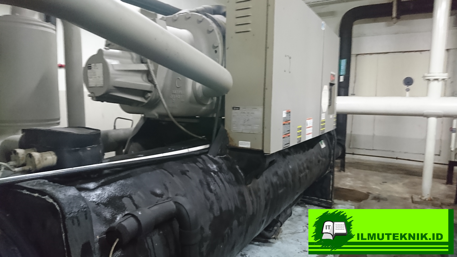 Kemudian refrigeran akan mengalir ke evaporator, di evaporator refrigeran menyerap panas dari media yang akan didinginkan dimana disini vang didinginkan adalah air. Air yang telah didinginkan oleh evaporator akan di alirkan menuju AHU dan FCU oleh pompa sirkulasi air dingin. Di AHU dan FCU air dingin tadi akan masuk ke koil pendingin kemudian akan di hembuskan oleh blower sehingga udara dingin dari air akan di salurkan menuju ke ruangan-ruangan melewati saluran ducting. Selanjutnya air dari koil tadi akan mengalir lagi ke evaporator untuk didinginkan kembali. Refrigeran yang telah menyerap panas dari air akan berubah fase menjadi gas dan dialirkan kembali menuju ke kompresor untuk di kompresi begitu seterusnya selama sistem bekerja.