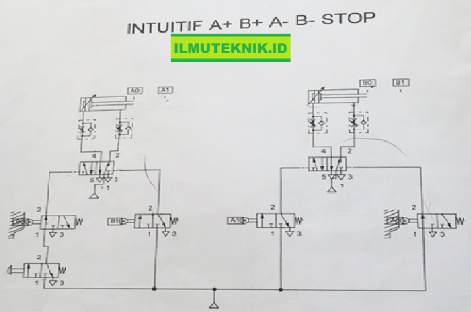 Saat piston A bergerak ke belakang, piston A akan memberikan perintah mekanik ke katup 3/2 roll A0. Sehingga saluran 1 dan 2 terhubung, lalu katup 3/2 roll A0 memberikan perintah pneumatik ke katup 5/2 B yang menyebabkan saluran 1 dan 4 terputus dan saluran 1 daan 2 terhubung, sehingga udara bertekanan akan mengalir dari saluran 2 kemudian mengalir ke double acting cylinder B dan menggerakan piston B ke belakang.