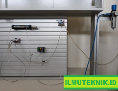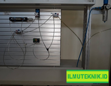 Saat katup Air Service Unit dibuka, udara bertekanan mengalir ke Distributor 8 Holes. Kemudian udara betekanan akan menuju ke saluran 3/2 Normally close, saluran 5/2 kiri dan kanan perintah pneumatik dan saluran 3/2 Normally close (dengan roller). Posisi awal rangkaian bila tidak perintah kerja, udara bertekana langsung menuju katup 5/2 saluran 1 terhubung dengan saluran 2 dan udara bertekanan melewati Katup Throtle yang dapat mengatur kecepatan pengisian volume pada Double acting silinder, aliran udara dari katup throtle akan menuju ke saluran kanan Double acting silinder yang membuat piston bergerak mundur atau kembali. Jika katup 3/2 Normally close ditekan maka ruang yang sebelumnya berada diruang kanan akan berpindah keruang kiri dan membuat aliran udara terhubung ke saluran kerja, dari saluran kerja Katup 3/2 udara betekanan menuju Katup 5/2 dan membuat perintah pneumatic pada katup 5/2 sehingga ruang yang awalnya sebelah kanan akan berpindah sebelah kiri sehingga aliran udara dari Distributor 8 holes akan terhubung ke saluran kerja 4 dari katup 5/2 dan aliran udara melewati katup throtle dan langsung menuju saluran kiri Double acting silinder yang membuat piston bergerak maju. Disini katup 3/2 dengan roller berfungsi untuk membuat piston kembali dengan cara, jika roller tersentuh piston yang bergerak maju maka akan membuat ruang dari katup 3/2 dengan roller berubah yang posisi semula di ruang kanan berubah menjadi ruang kiri yang membuat aliran udara bertekanan terhubung ke saluran kerja dari katup 3/2 menuju ke saluran kanan 5/2 dengan memberi perintah pneumatik yang membuat ruang dari katup 5/2 berubah dari yang sebelumnya berada di ruang kiri kini menjadi kembali keruang kanan dan akan saluran 1 akan terhubung ke saluran kerja yaitu saluran 2, begitulah seterusnya jika katup 3/2 ditekan akan membuat piston bergerak maju dan pada saat piston mengenai roller dari katup 3/2 dengan roller akan membuat piston dari double acting silinder bergerak mundur.