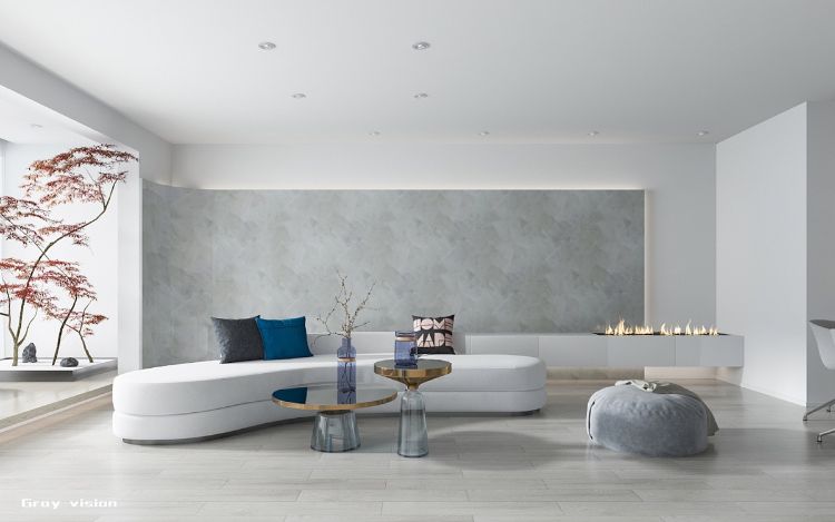 Terdapat pohon kecil tinggi yang menambah kesan natural dalam ruangan. Model Interior seperti ini juga bisa dikategorikan sebagai bagian dari desain kontemporer, namun tonjolan nilainya kontemporernya hanya sedikit saja.
