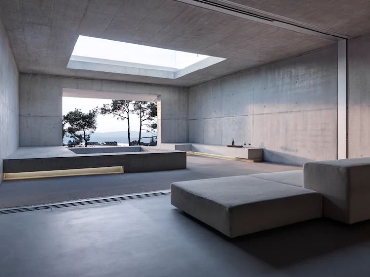 Bisa dilihat pada gambar di atas yang menampilkan sebuah mobil terparkir dalam ruangan yang terlihat langsung dari ruang duduk keluarga. Warna putih dan sentuhan warna mewah lainnya turut menghasu desain interior ini. Desain ini tampak lebih luas dengan furnitur secukupnya.
