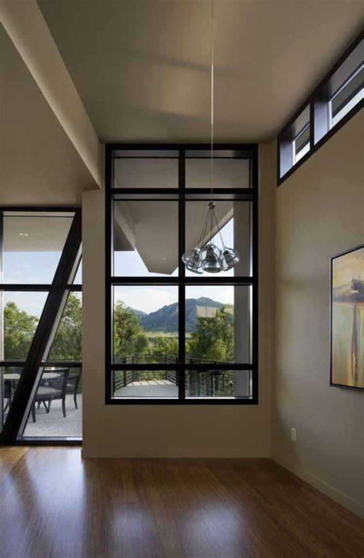 Jendela ini menggunakan kaca dengan pembatas kayu yang tinggi sesuai ketinggian bangunan. Sedangkan gordennya menggunakan gorden kain biasa yang bisa digelar untuk menutup pemandangan saat malam hari. Jendel model ini cocok untuk rumah di sekitar lingkungan alam.