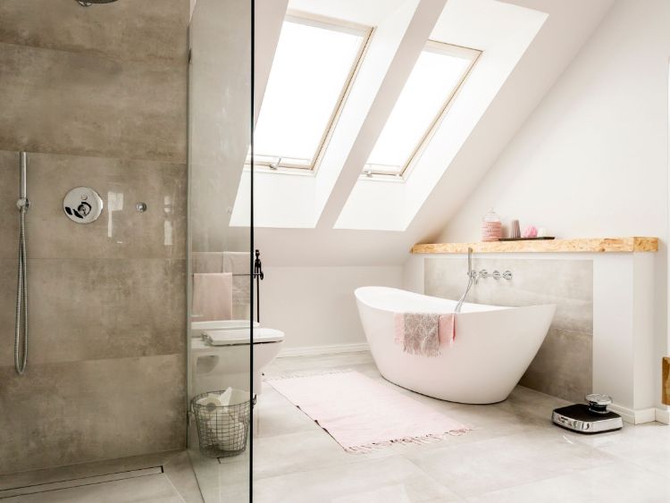 Kamar mandi ini bisa dibuat di loteng dengan memanfaatkan cahaya dari atas atap. Tempatkan battune di bagian yang terkena sinar matahari sehingga Anda betah saat melakukan aktivitas berendam. Selain tiu aksen warna putih ditambah dengan batu alam membuat desain kamar mandi ini semakin menarik.