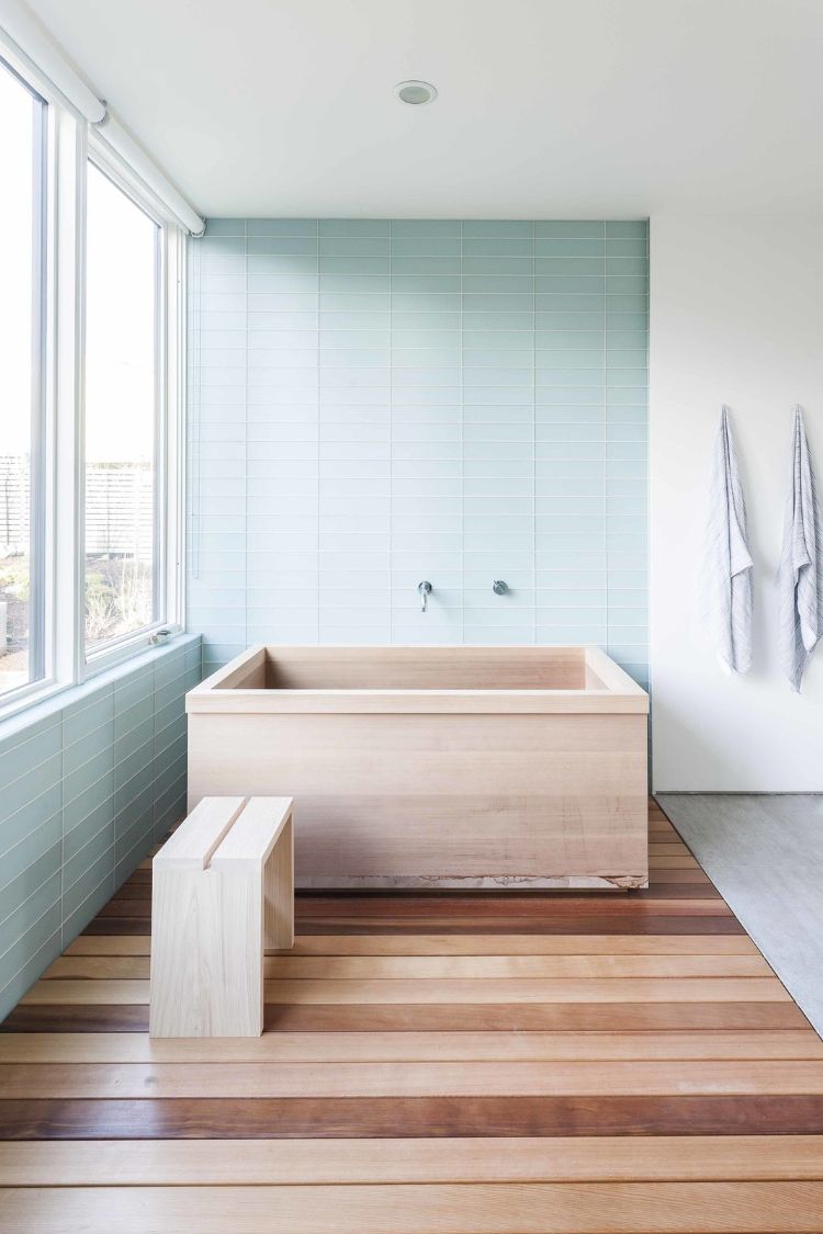 Pada bagian lantai gunakan parket kayu yang tahan air. Untuk desain bak atau bathtub bisa menggunakan bak klasik dengan tipe balok. Disebelahnya tempatkan kursi untuk duduk, sehingga cocok untuk orang yang ingin mandi dan berendam air hangat seperti di pemandian Jepang.