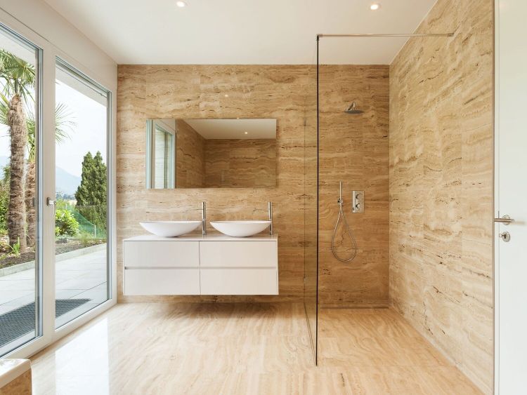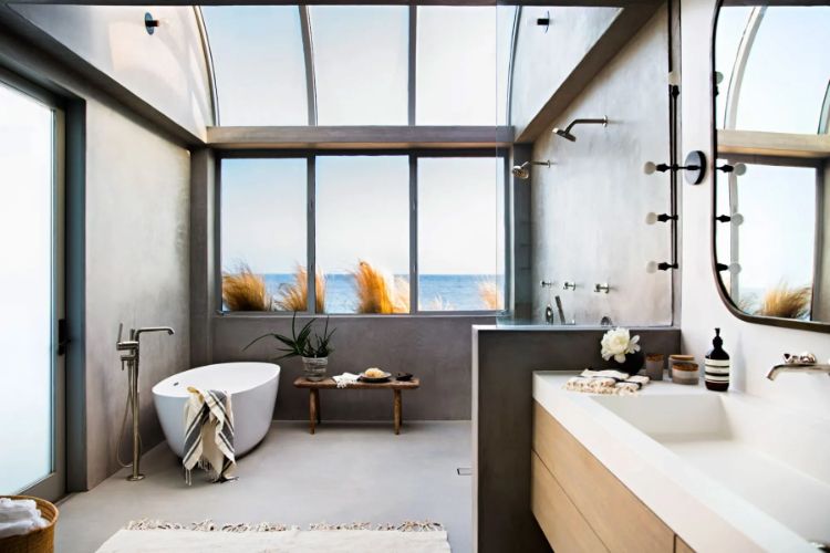Corak pada lantai dan dinding bathtubnya juga punya keunikan tersendiri. Desain costal memang sangat cocok untuk Anda yang suka dengan nuansa desain hangat namun modern.