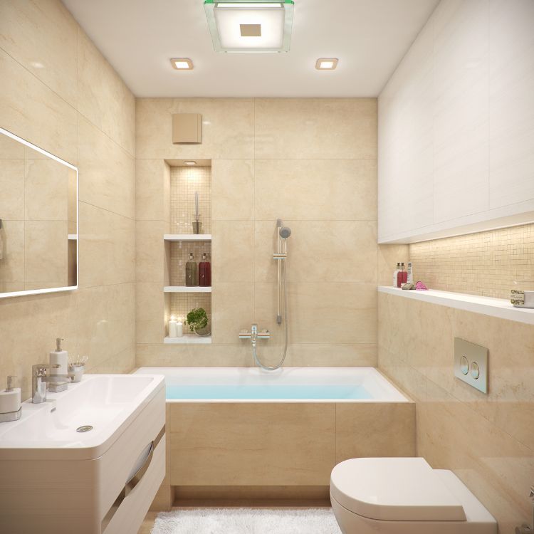 Kamar mandi dengan tipe desain ini menonjolkan kesan sederhana namun tetap terlihat mewah dan rapi. Penggunaan warnanya lebih dominan dengan warna cream yang dipadukan dengan furniture berwarna putih.