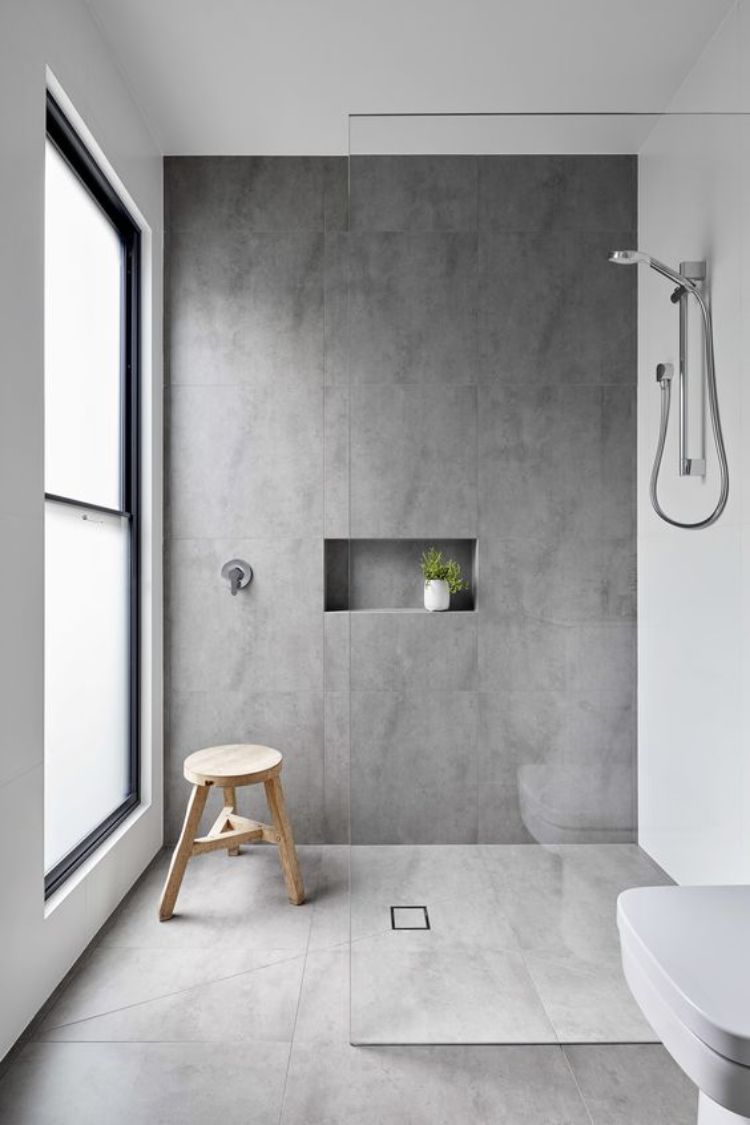 Tipe desain monokrom sudah cukup populer digunakan dalam dunia interior hunian. Monokrom biasanya memakai perpaduan dua warna netral yang terkesan lebih berkelas. Pada gaya kamar mandi minimalis yang satu ini menggunakan perpaduan warna abu dan putih kusam.
