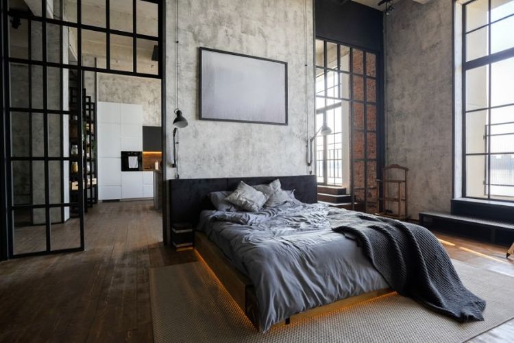 Bisa dilihat betapa kentalnya nilai industrial yang dibawa oleh desain kamar di atas. Tampilannya yang unfinished pada sekat-sekat kotaknya sangat menggambarkan nuansa industrial. Ditambah lagi perpaduan warnanya yang gelap membuatnya tampak lebih gagah.
