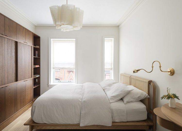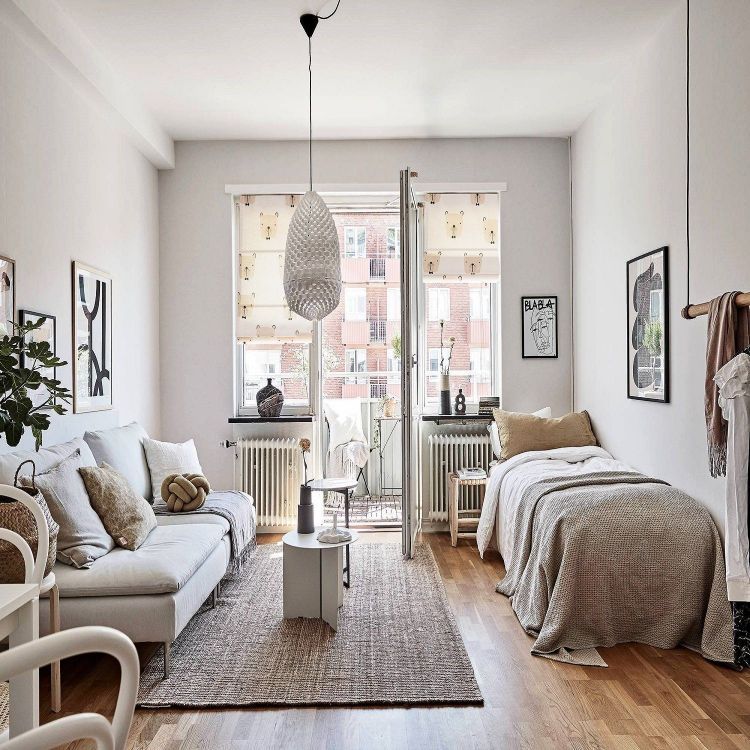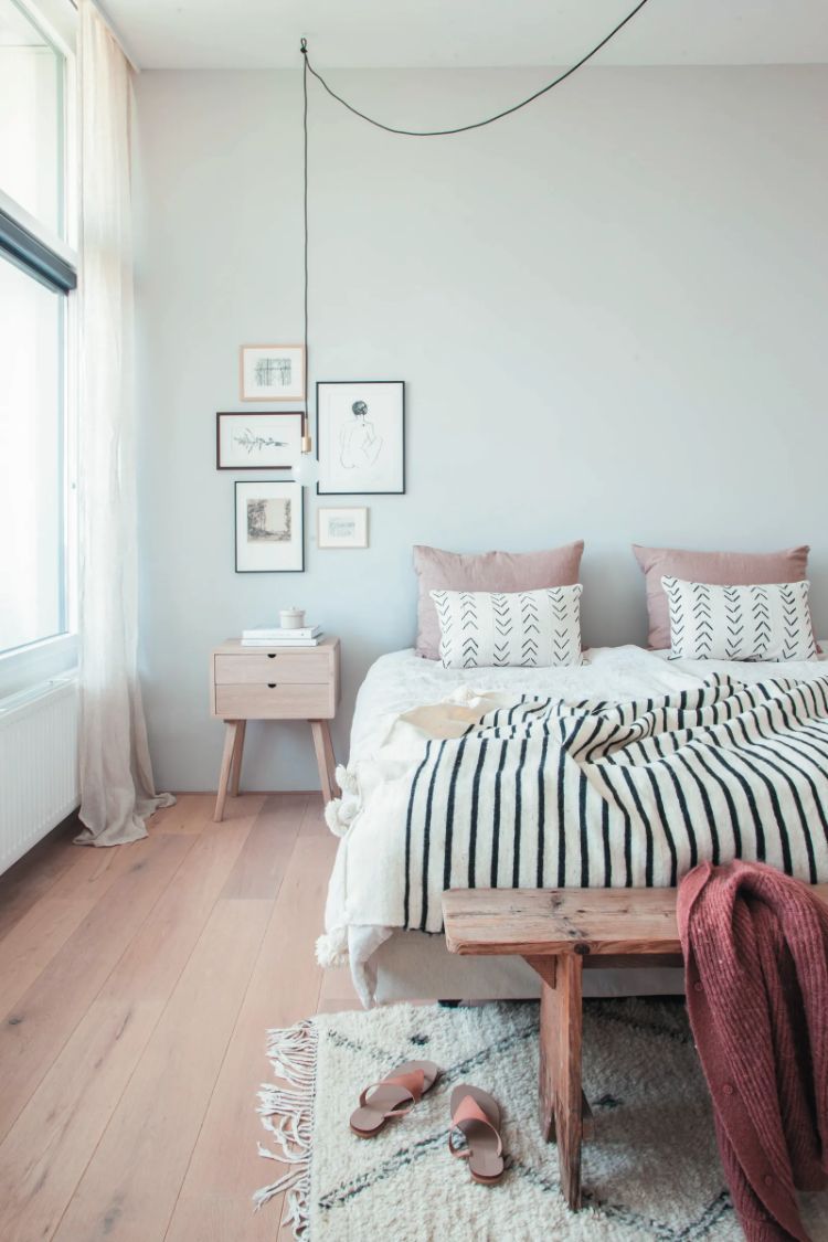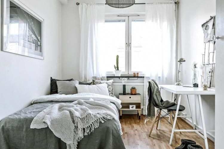 Paduan warna putih terang dan cream sangat memperlihatkan kesan tipe interior skandinavjan. Penambahan tumbuhan kecil di pojok kamar akan memberikan nuansa sejuk. Penggunaan cahaya lampu atas dan di sisi ranjang tidur juga menonjolkan nilai skandinaviannya.