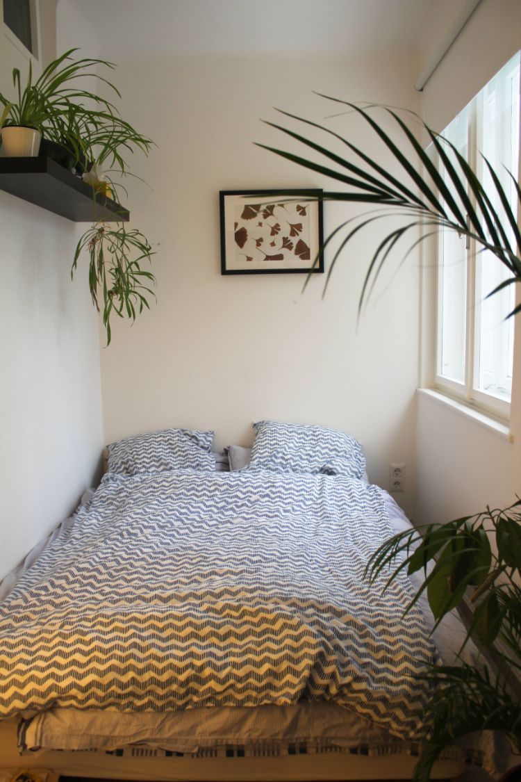 Lahan sempit untuk kamar tetap bisa terlihat nyaman dengan tampilan desain minimalis. Desain kamar ini menggunakan one bed yang biasa dipakai untuk satu orang. Menggunakan perpaduan warna soft yang menambah kesan hangat.