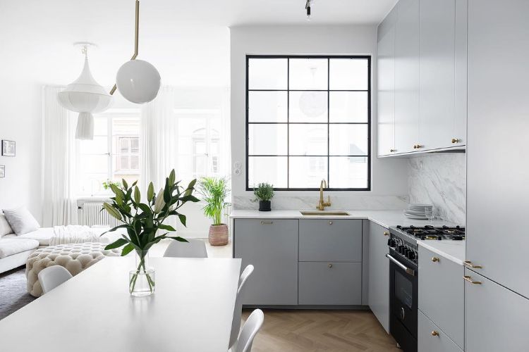 Menggunakan warna putih pada desain sebuah ruangan memang memberikan kesan estetik tersendiri. Penambahan warna-warna tertentu pada perabotan, seperti hitam di pada oven serta adanya jendela dengan rangka berwarna hitam akan menambah kesan estetik.