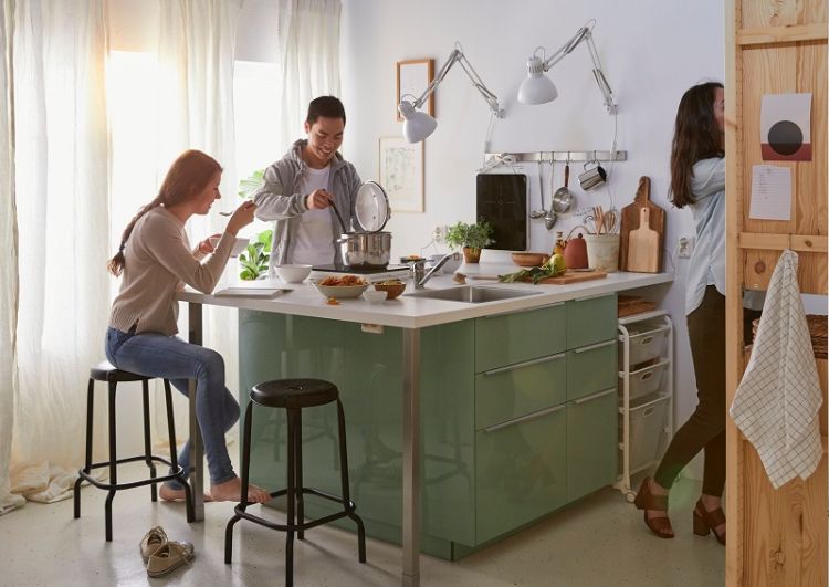 Karena di dalam satu meja sudah memuat tempat untuk memasak, mencuci piring, bahkan bisa untuk meja makan. Penggunaan warna pastel dan adanya tambahan furniture kayu di dalamnya bisa membuat suasana menjadi hangat dan manis.