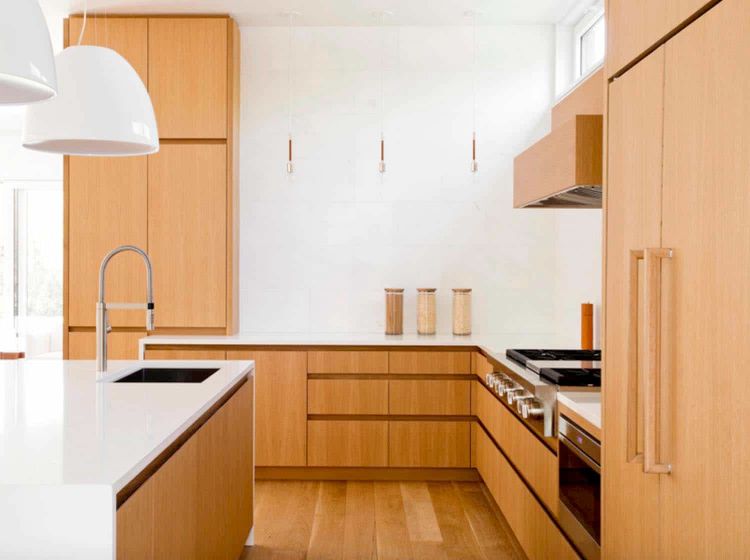 Kitchen set dengan gaya Japandi banyak didominasi oleh material yang berasal dari bahan baku kayu. Selain itu desain dari kitchen set ini juga memaksimalkan adanya space-saving. Biasanya desain kitchen set diposisikan berada pada di pojok ruangan dengan manis.