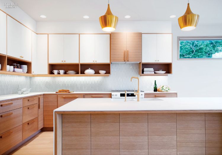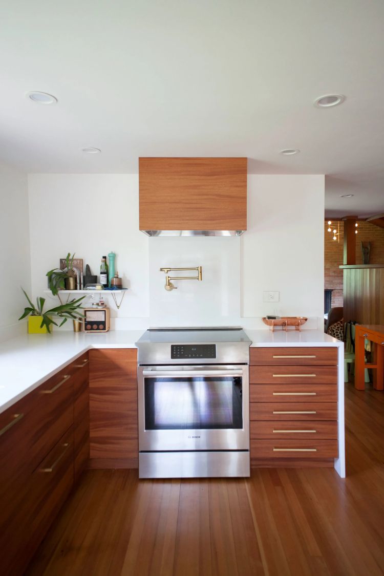 Selain bisa membuat ruangan terasa nyaman, penggunaan berbagai furniture dari bahan kayu juga bisa membuat ruangan menjadi terlihat elegan. Penggunaan perpaduan antara kabinet kayu dan warna putih membuat tampilan dari dapur terlihat manis dan bersih.