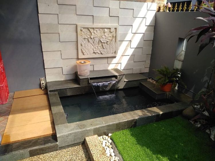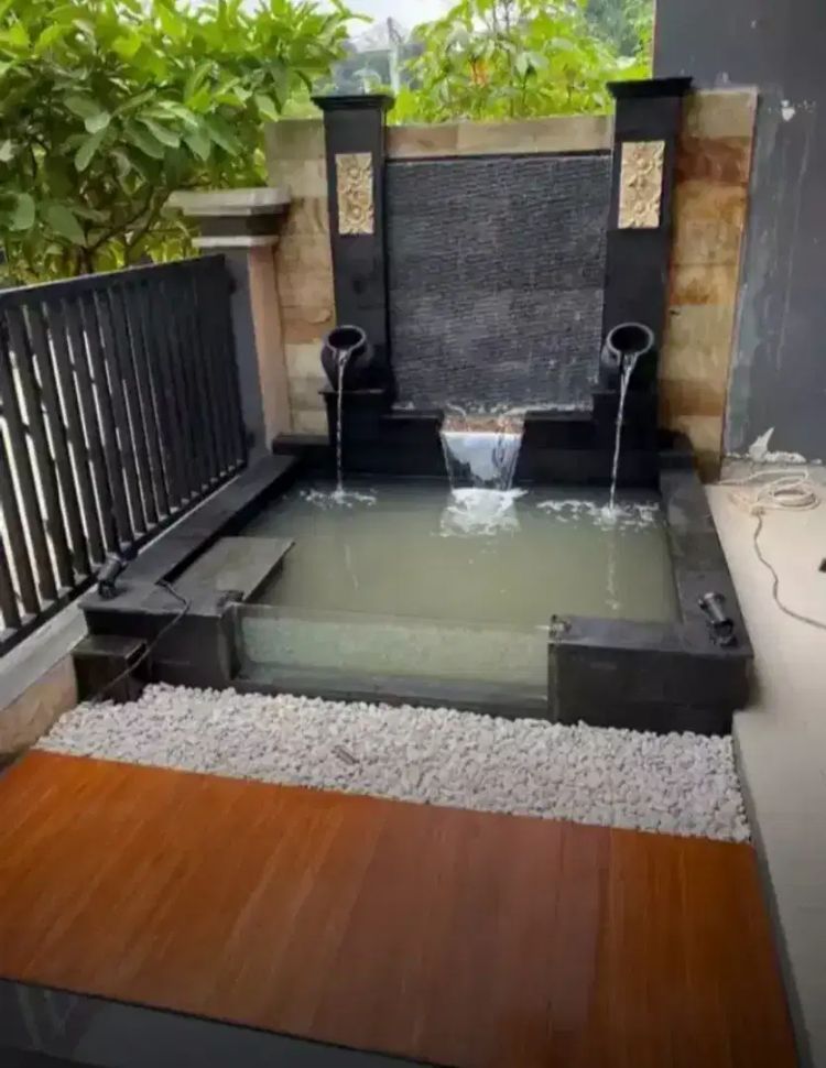 6. Kolam Koi Minimalis dengan Air Terjun Tiga Tingkat