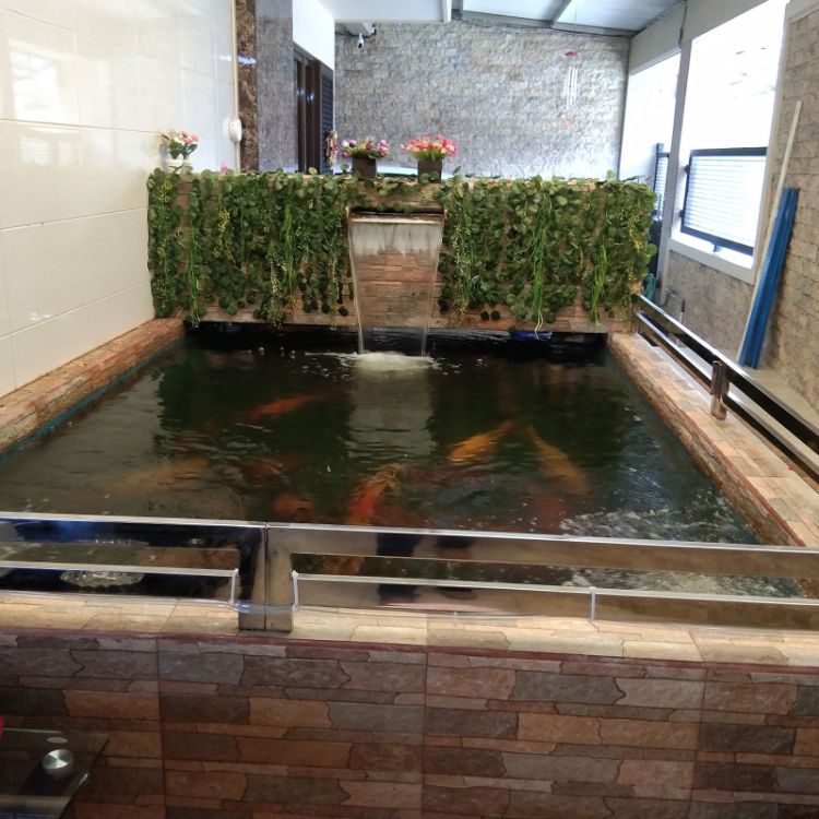 Dapat Anda perhatikan melalui gambar tersebut, ukuran kolam koi yang mungil tidak menjadi masalah dalam memelihara ikan. Anda masih bisa mengamati ikan secara jelas dengan adanya dinding kaca serta desain kolam yang dihiasi marmer bewarna coklat dan putih.