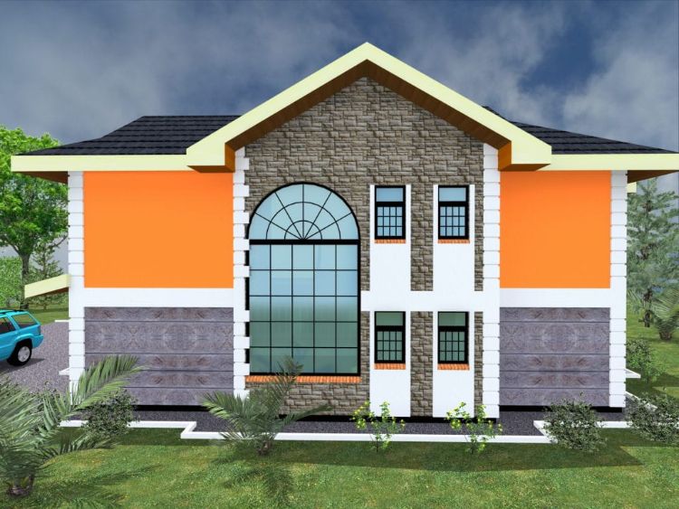 Sementara di sisi kanan kiri lantai dua dicat dengan warna oranye cerah agar tampak ceria. Bagian bawah rumah dicat dengan cat motif abu-abu gelap yang cantik.