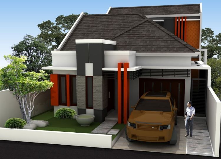 Kombinasi cat rumah minimalis antara warna oranye cerah lantai dua dikombinasikan dengan warna putih di beberapa bagian mampu memberikan suasana yang lebih hidup pada eksterior rumah. Atap rumah menggunakan genting berwarna gelap sebagai penyeimbang warna-warna cerah di tembok.