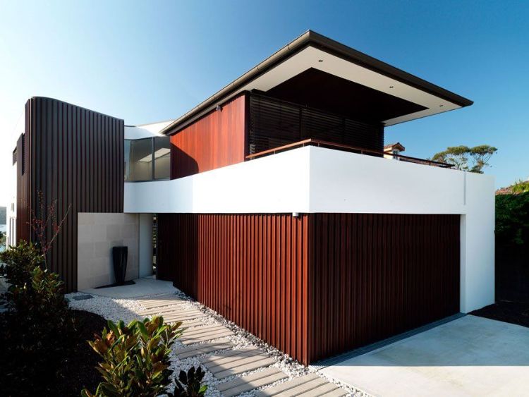 Ciptakan nuansa natural pada desain eksterior rumah dengan menggabungkan antara cat dinding warna cokelat krem dengan putih netral. Cat cokelat krem dilapisi pada tembok dari papan kayu yang dipasang horizontal sehingga rumah tampak luas.
