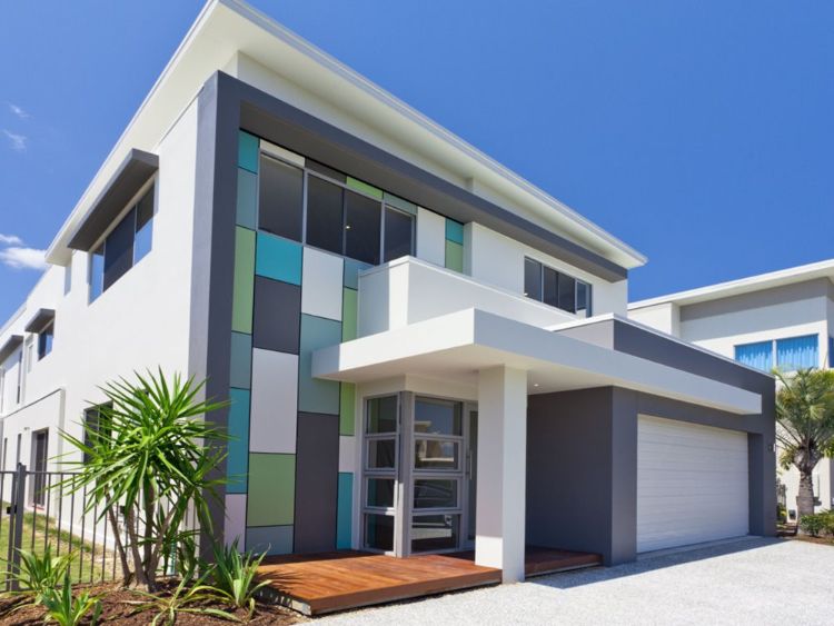 Desain eksterior hunian minimalis satu ini sangat unik dengan mengkombinasikan beberapa warna dalam satu bagian tembok. Beberapa warna seperti putih, abu-abu tua, hijau, biru diaplikasikan dalam satu bagian dinding dan dibentuk seperti kotak-kotak bersusun yang abstrak.