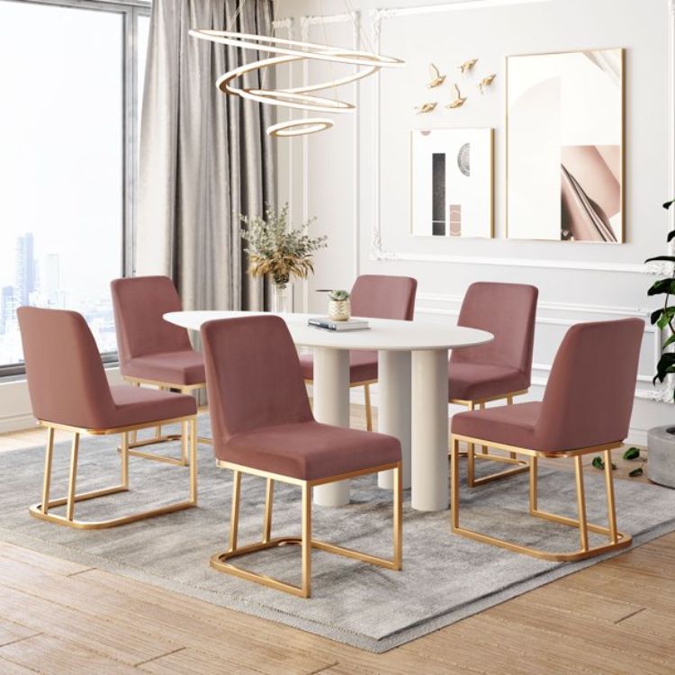 Kaki kursi yang berwarna emas menambahkan unsur kemewahan. Tak lupa tambahkan meja putih untuk memudahkan peletakan barang-barang.